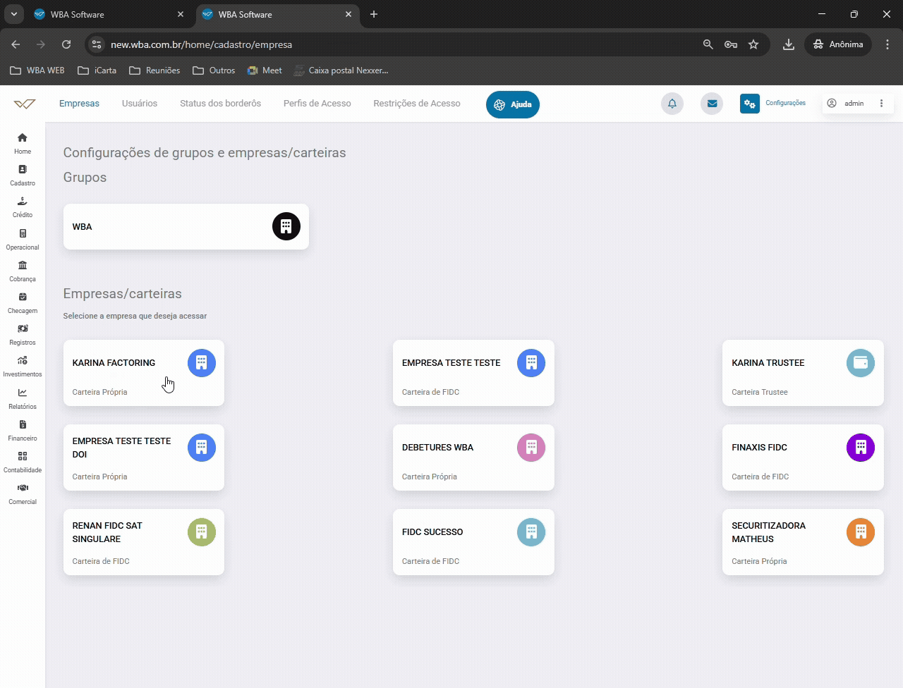 O usuário deve possuir perfil com permissão administrativa para acessar as configurações da empresa/carteira.